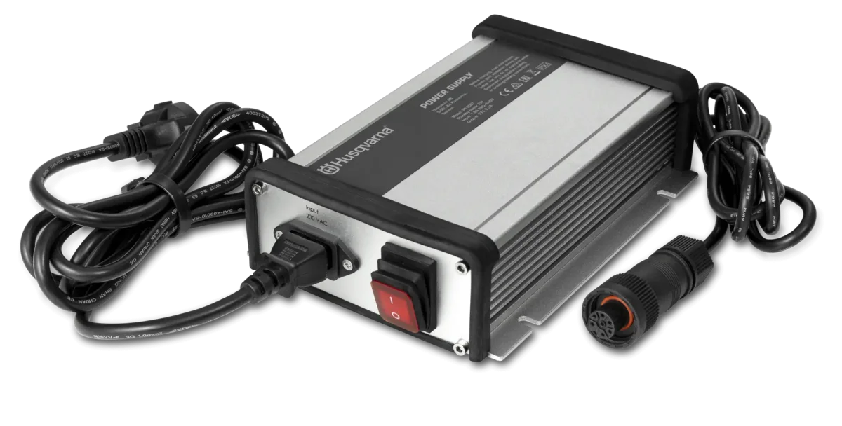 PS300T är en 300W batteriladdare för laddning av 48V Li-ion batterier för åkgräsklippare. Den ansluts till produkten med en gänganslutning och kan monteras på väggen för smidig åtkomst.