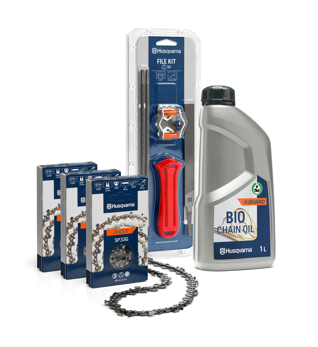 Tillbehörspaket med förbrukningsvaror till din motorsåg. Passar till Husqvarna motorsågar med 13″ svärd som har .325″ kedjedelning och 1.3mm spårvidd. 13″ 1,3mm sågkedja är standard till Husqvarnas bensindrivna motorsågar i 400-serien och vissa i 500-serien.