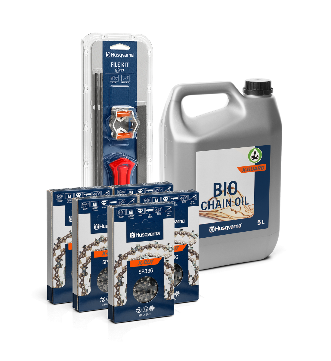 Tillbehörspaket med förbrukningsvaror till din motorsåg. Passar till Husqvarna motorsågar med 13″ svärd som har .325″ kedjedelning och 1.3mm spårvidd. 13″ 1,3mm sågkedja är standard till Husqvarnas bensindrivna motorsågar i 400-serien och vissa i 500-serien.