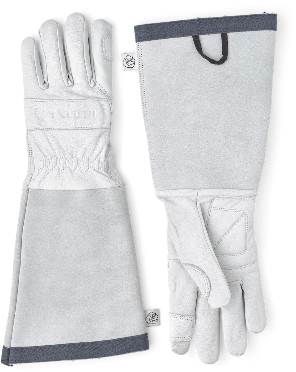 Hestra handske i getskinn, långkrage, vadddering innerhand. En smidig modell i slitstarkt getskinn för trädgårdsarbete. Den långa kragen i nötspalt skyddar underarmarna mot taggar från rosor och buskar. Försedd med lätt vaddering i handflatan för ytterligare komfort. Upphängningsöglor