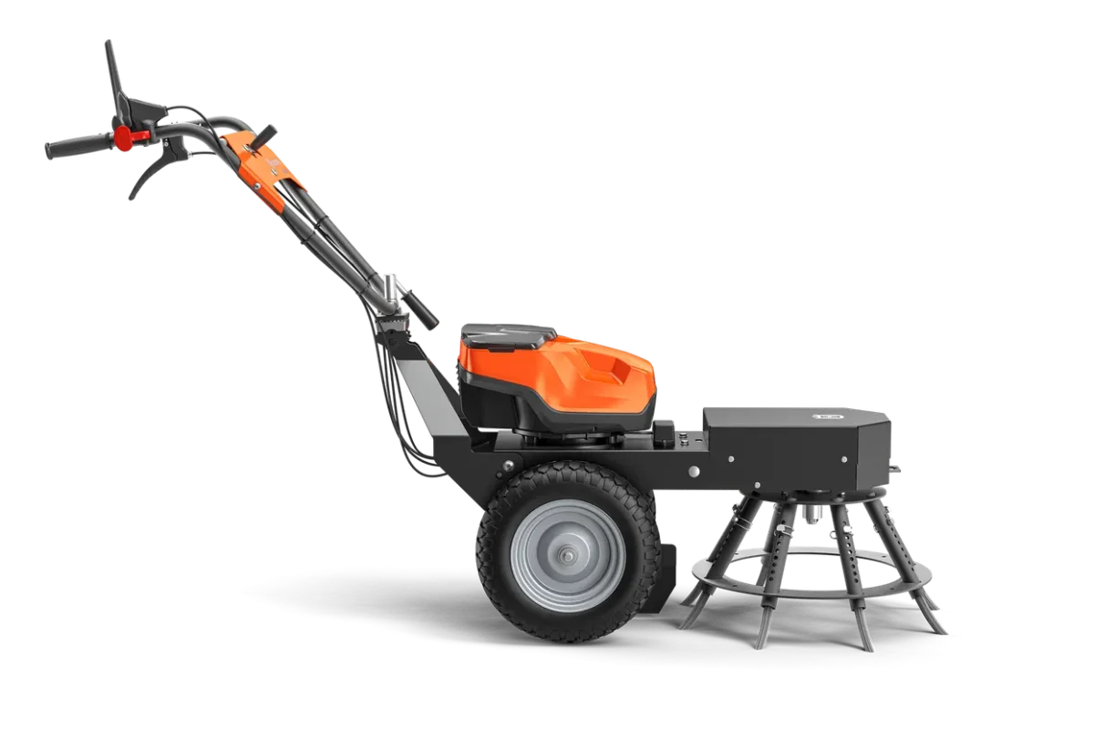 Styret fälls ner och roteras 180 grader, vilket gör att maskinen blir kompakt och förberedd för transport på släpvagn eller i en skåpbil.