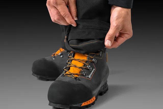 Den nedre delen av skyddsvadderingen inuti byxorna är förstärkt för att förhindra slitage på sågskyddet, vilket garanterar långvarig hållbarhet. Motorsågsskyddet är helt täckt, vilket minskar risken för att sågspån tränger in i materialet.