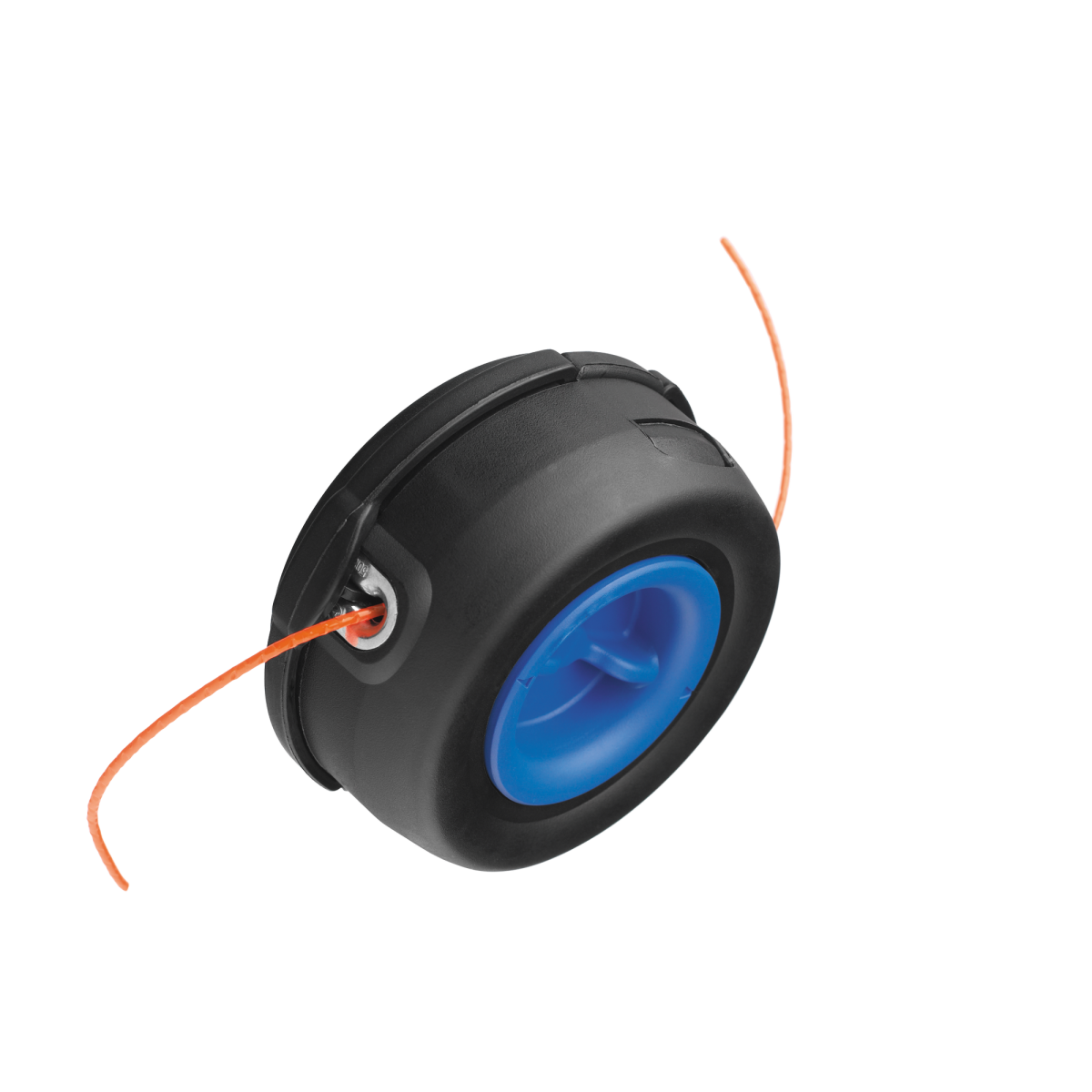 Trimmerhuvud med manuell trådmatning. Användaren matar ut tråden manuellt genom att trycka på trådmatningsknappen och dra i tråden.