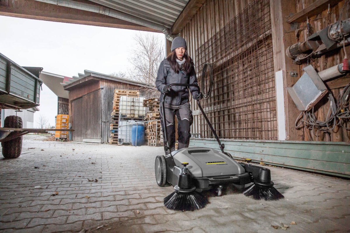 Sopmaskinen KM 70/15 C 2SB är som standard utrustad med två hopfällbara och steglöst justerbara sidoborstar och underlättar och påskyndar sopningsarbetet både på insidan och på utsidan. Huvudborstens dubbelsidiga metalldrift, som är försedd med universella borstborstar, ger samma högkvalitativa rengöringseffekt både i vänster- och högerkurvor. Maskinen är upp till sex gånger snabbare än konventionella sopmetoder. Det kontrollerade luftflödet och ett integrerat dammfilter förhindrar på ett tillförlitligt sätt att damm rörs upp. Skjuthandtaget kan svängas och justeras till tre olika höjder för att ge extra komfort.